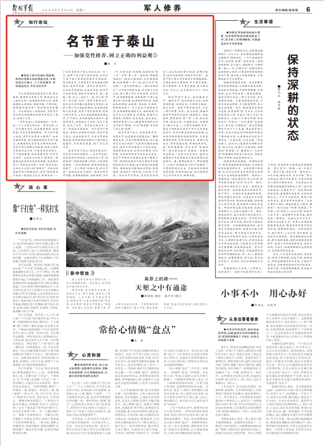 “名节重泰山,利欲轻鸿毛。”名节,是一个人立身处世之本。事实证明,人一旦不顾及名节,就会蝇营狗苟、蜕化堕落,乃至变得寡廉鲜耻。对于共产党人来说,名节不仅事关人格尊严,也关乎党的形象,能不能做到视名节重于泰山,关键要看是否具有正确的利益观。党员干部只有摆正利益观,始终以党和人民的利益为重,才能清清白白做人、干干净净做事、坦坦荡荡为官,牢牢守住名节。无论是不让孩子“看白戏”、将票款如数交给戏院的焦裕禄,还是规定家人“不许沾公家的一点油”的谷文昌;无论是不让家人搭“顺风车”、不给任何亲戚开后门的杨善洲,还是“党性阵地不能在一张宣纸上失守”的杨业功……广大优秀的共产党人用自己的一言一行,诠释了共产党人的利益观,也标定了共产党人崇尚和珍惜名节的高度。然而现实中,个别党员干部利益观出现偏差,使名节受损。有的不崇尚名节,认为名节是虚的,利益是实的,重名节不如讲实惠;有的不珍惜名节,说一套做一套、台上一套台下一套,对人讲“名节”,对己讲“名利”;有的不看重名节,在大是大非问题上能做到立场坚定,但在小事小节上则放松要求,做出损害党和人民利益、党员干部形象的事;有的不坚守名节,工作之初能够做到珍惜名节,严于律己,然而随着职位的升迁,诱惑的增多,渐渐迷失了自我,丢失了原则,丧失了名节。名节是从政大节,大节一亏就会百事涂地。对于党员干部来说,须树立正确的利益观,视名节重于泰山,形成珍惜名节、守护名节的浓厚氛围,任何时候任何情况下都不能以权谋私,不能腐化堕落,毁了自己的名节。