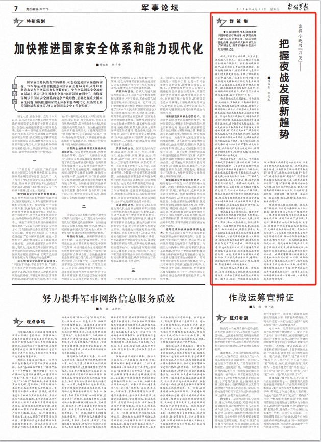 ●在夜间能见度不良的条件下能够持续有效战斗,对获得战场主动权具有重要意义。信息化智能化战场,夜战的形式和内涵发生了深刻变化,但掌控制夜权仍然不失为制胜之道
