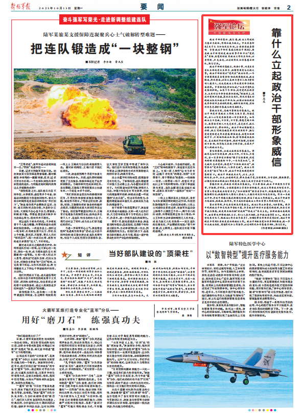政治干部的形象威信,绝非小事,而是关系军队生命线有无生命力、保障作用有与无的大事。政治干部被冠以“党代表”政治殊荣,一个重要原因就是自觉实行彻底的思想改造、政治锻造、作风塑造,以强大真理力量和人格力量引领人感召人,这也是政治工作永葆生命力的底层逻辑。罗荣桓同志曾回忆说:“士兵对党代表是很拥护的。如果下个命令,没有党代表的署名,士兵对这个命令就要怀疑的。”新征程上,建设对党绝对忠诚、聚焦打仗有力、作风形象良好的政治机关和政治干部队伍,必须以彻底的自我革命精神直面时代课题、破解深层问题,清除形形色色损害形象威信的负面因素。