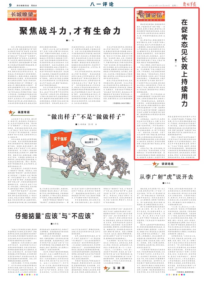 深入贯彻中央八项规定精神学习教育开展以来,全军广大党员干部潜心学习改造,深扎严正作风思想根子;深入查摆检视,向深向实起底潜规积弊;从严整改整治,纯洁巩固部队风气生态;激励担当作为,聚力推动部队高质量发展,成效值得肯定。但学习教育的结束不是休止符,而是新起点。我们只有始终保持久久为功的劲头,在巩固拓展学习教育成果上下功夫,才能让“铁规矩、硬杠杠”的效能持续激发。