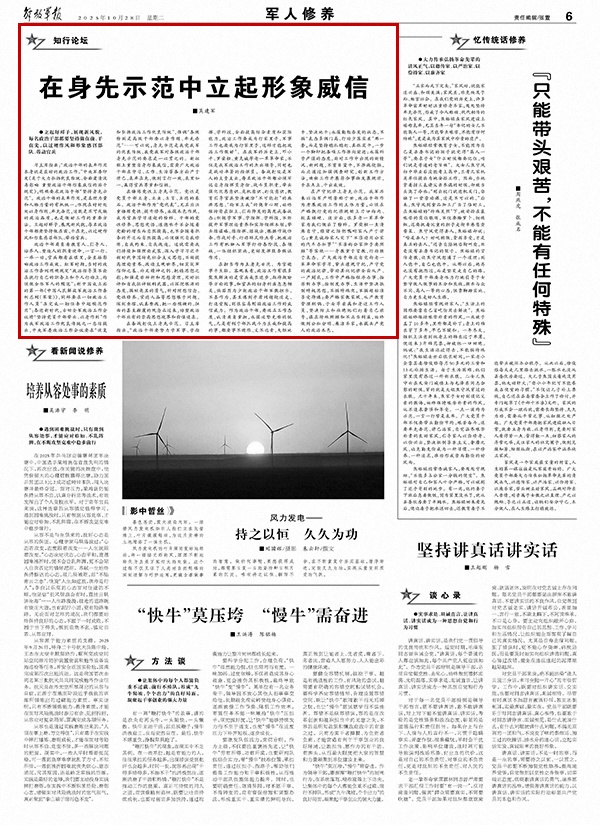 ●立起好样子,展现新风貌,每名政治干部都要坚持做在前、干在先,以过硬作风和形象感召部队、带动官兵