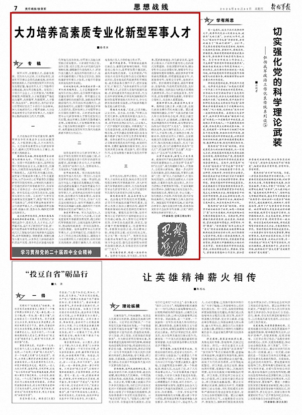 强军兴军,关键靠人才,基础在教育。党的十八大以来,习主席站在党、国家和军队事业全局的战略高度,始终把院校教育和人才培养摆在强军兴军的优先发展位置,推动我军人才工作取得历史性成就、发生历史性变革。在党的二十届四中全会上,习主席强调,“统筹教育强国、科技强国、人才强国建设”“推进政治建军、改革强军、科技强军、人才强军、依法治军”。新征程上,我们必须学习好贯彻好党的二十届四中全会精神,深入实施新时代人才强军战略,大力培养高素质专业化新型军事人才,为强军事业提供坚强有力的人才支撑。