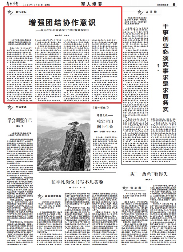 增强团结协作意识当恪尽职守、全力作为。“积力之所举,则无不胜也”。强军事业犹如一台庞大的机器,要想实现高速高效运转,不断生成无坚不摧的强大战斗力,需要每名官兵不断强化事业心和责任感,各司其职、各尽其责,奋勇争先、拼搏向前,拿出最好的状态,使出最大的气力,练就最强的本领,做出过硬的业绩。回望来路,广大官兵听令景从、闻令而动,卫国戍边不负重托,备战打仗枕戈待旦,维和护航冲锋在前,抢险救灾勇挑重担……以守土有责、守土负责、守土尽责的昂扬精神状态投身强军实践,把青春和汗水播洒在强国建设、民族复兴的新征程上。前进道路上,倘若有人消极懈怠、履职不力,便会如机器上“松动的零件”,影响体系运转、迟滞工作进程。当前,距离实现建军一百年奋斗目标还有不到两年时间,时不我待、任重道远,需要广大官兵进一步强化使命担当、振奋精神状态,敢于冲锋在前、向难而行,做到千钧重担众人挑、人人肩上有指标,不折不扣、高质高效抓好各项工作落实,在求真务实中干事创业,在敢作善为中建功立业。