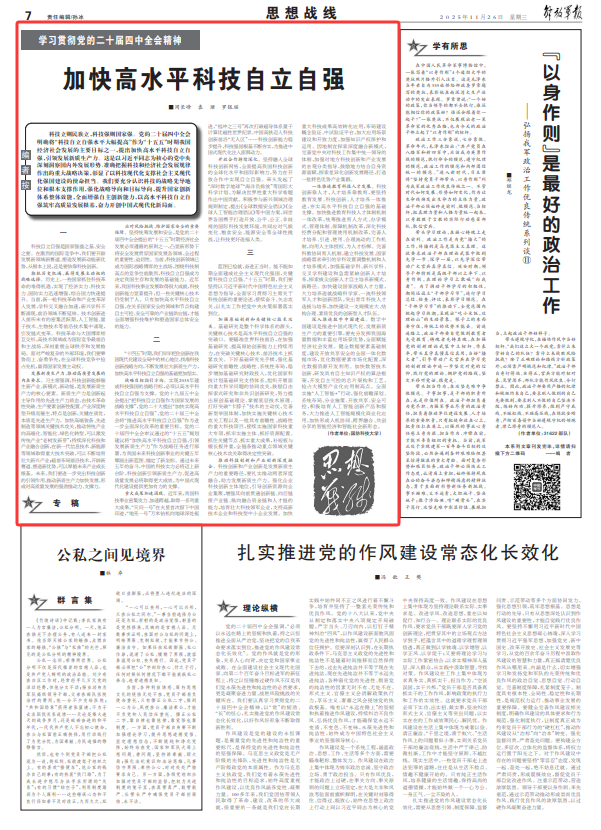 科技立则民族立,科技强则国家强。党的二十届四中全会明确将“科技自立自强水平大幅提高”作为“十五五”时期我国经济社会发展的主要目标之一,提出加快高水平科技自立自强,引领发展新质生产力。这是以习近平同志为核心的党中央深刻洞察国内外发展形势、准确把握科技和经济社会发展规律作出的重大战略决策,彰显了以科技现代化支撑社会主义现代化强国建设的使命担当。我们要充分认识科技的战略先导地位和根本支撑作用,强化战略导向和目标导向,提升国家创新体系整体效能,全面增强自主创新能力,以高水平科技自立自强筑牢高质量发展根基,奋力开创中国式现代化新局面。