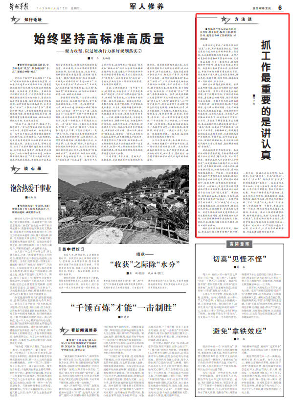 讲认真就要保持严实作风。讲认真,要求我们做任何事情都严肃对待、一丝不苟。倘若总是大大咧咧、马马虎虎,只求“过得去”、不求“过得硬”,满足于“差不多”,许许多多“差不多”累积起来就会“差很多”。基层各项工作亦如此,只有注重细节,做到严谨细致,工作才能不留隐患,事业才能顺利发展。年轻干部要养成严谨细致、求真务实的工作作风,把思路理清、把流程想细、把环节抓准,对待工作精雕细琢、下足“绣花”功夫;炼就“火眼金睛”,不忽视任何一个细节,不放过任何一个疑点,确保各项工作无偏差、无漏洞、无死角。要以工匠精神谋事做事,树牢精品意识,做到“凡经我手,务必精准”,在涉及部队战斗力增长、高质量发展和官兵忧思关切的问题上,更要以“时时放心不下”的责任感全力以赴、真抓实干,以严实作风破解难题,为基层建设持续贡献力量。