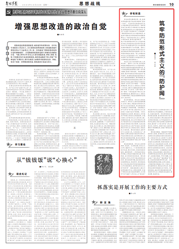 健全制度机制。形式主义具有顽固性、反复性。从实践来看,形式主义之所以屡禁不止,一个重要原因是制度不完善、执行不到位,存在责任落实虚化、监督考核单一、问责机制不健全等问题,必须着力构建系统完备、科学规范、运行有效的长效机制。强化制度供给,针对工作中可能出现的急功近利、盲目决策等问题,建立健全重大决策调研论证、风险评估、责任倒查机制,并及时把实践中的好经验好做法上升为制度规范,筑牢防范形式主义的“防护网”。狠抓制度执行,锲而不舍贯彻落实中央八项规定精神、军委十项规定及其实施细则精神,大力倡导“四下基层”工作方法,以“零容忍”的态度对形式主义顽疾露头就打,对典型案例公开通报曝光,不留回旋余地、压减变通空间。优化考核机制,破除重痕迹数据、轻实绩实效的不良导向,将民生改善情况、群众满意度等作为考核重要指标,与干部选拔任用、评优评先挂钩,同时也要健全容错纠错机制,落实好“三个区分开来”,防止问责泛化、简单化,为敢于担当、踏实做事的干部撑腰鼓劲,营造干事创业的良好氛围。