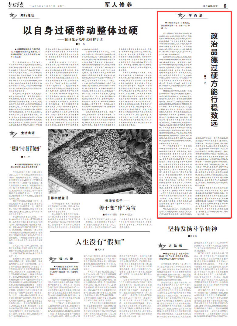 习主席指出:“德包括政治品德、职业道德、社会公德、家庭美德等,干部在这些方面都要过硬,最重要的是政治品德要过得硬。”政治品德是党员干部德才标准的首要内容,是共产党人党性修养和人格魅力的集中彰显。政治品德始终过硬,思想上政治上才不会偏航错位,为官做人才能正气充盈,事业之路、人生之路才能行稳致远。