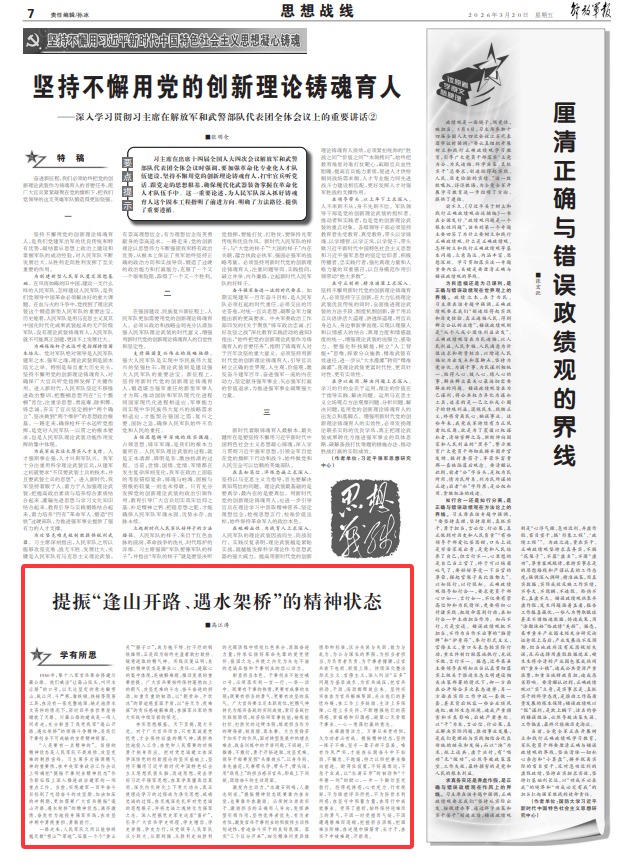 一路走来,人民军队之所以能够跨越无数“雪山”“草地”,征服一个个“娄山关”“腊子口”,成为拖不垮、打不烂的钢铁雄师,正是因为始终充盈着敢打敢拼、锐意进取的精气神。实践反复证明,良好的精神状态是事业心、责任心、进取心的集中体现,是破解难题、推动发展的重要前提。广大官兵要始终保持蓬勃向上的朝气、攻坚克难的斗志、奋斗奋进的拼劲、知重负重的韧劲,以“朝受命、夕饮冰”的紧迫感直面矛盾,以“昼无为、夜难寐”的责任感破解难题,在强军兴军的伟大实践中续写新的荣光。