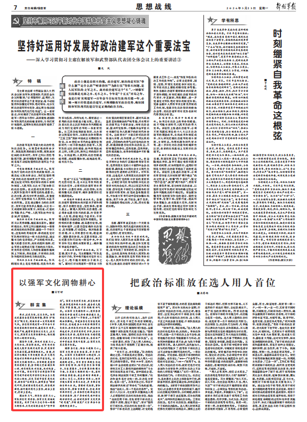 兵者,以武为植,以文为种。如果说武器装备是军队的骨骼,那作为“软实力”的文化,则滋养着一支军队的精气神。在打好实现建军一百年奋斗目标攻坚战的关键时刻,越是任务艰巨、挑战严峻,越需要坚持以文化人、以文育人,用强军文化厚植根和魂,构筑润物耕心的精神家园。