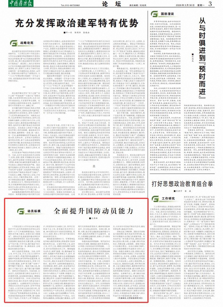 十四届全国人大四次会议审议通过的《中华人民共和国国民经济和社会发展第十五个五年规划纲要》指出,“加快国防动员能力建设,加强后备力量建设”。国防动员是连接国防建设和经济社会发展的桥梁纽带,是应对安全威胁,支援保障打赢战争的关键支撑,必须锚定“可信可靠,可用可造,随时能战”的目标,加快构建平战一体、精准高效、全域联动的国防动员能力。