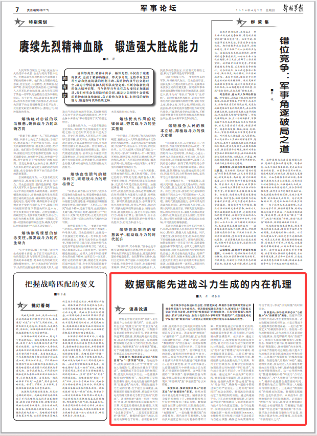 随着战争形态加速向信息化、智能化演进,数据作为新型战略资源正深刻重塑着战斗力生成模式。促进数据赋能先进战斗力,既要防止“有数据无算法”的算力浪费,也要警惕“唯数据论”的机械僵化。只有坚持数据与机理融合、技术与战术咬合,在数字化练兵中不断积累“数据资产”,在智能化对抗中反复打磨“数据利刃”,才能真正将数据优势转化为未来战场的胜势。