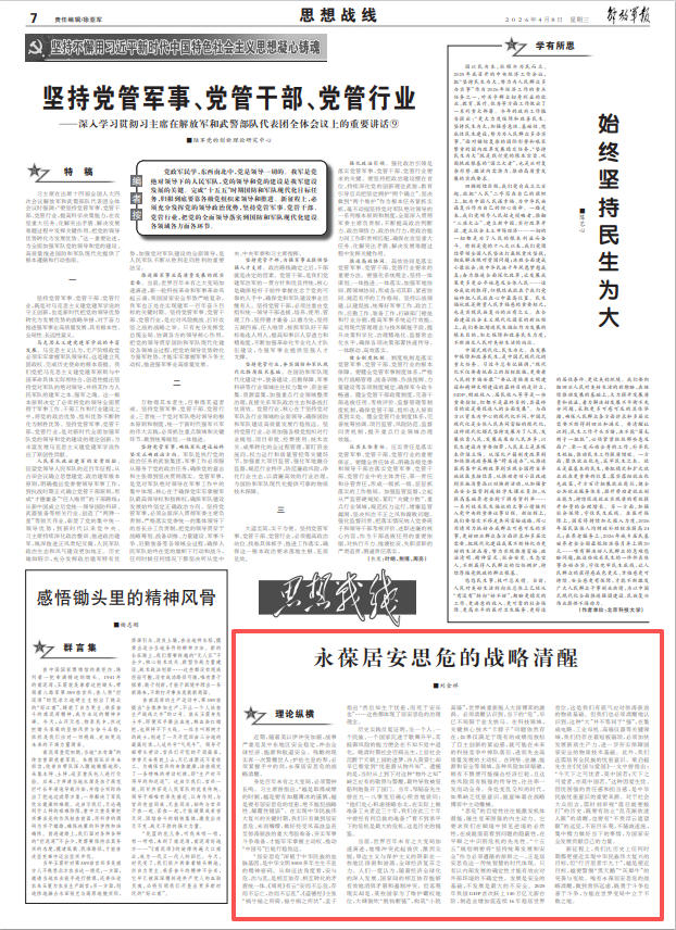 近期,随着美以伊冲突加剧,战事严重危及中东地区安全稳定,冲击全球经济、能源和航道安全。残酷的现实再一次警醒世人:护佑生息的犁,必须紧握手中的剑,永葆居安思危的战略清醒。