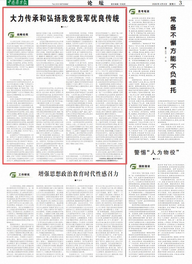 我党我军优良传统是时代的产物,也是实践的结晶。大力传承和弘扬我党我军优良传统,必须不断探索践行路径、丰富形式载体、提升实际成效,切实把优良传统根植于心、熔铸于魂,为新时代强军事业提供不竭精神动力。