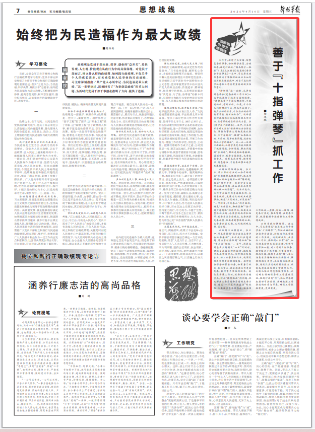 以躬身践行弹好琴。在文中,习主席要求“在具体工作中要学会‘十指弹琴’”,即把正确的认识论和方法论,转化为行之有效的工作实践。这提醒我们,在具体工作中,要做到心中有“谱”,如同演奏前熟知乐谱旋律、明确节奏节拍一般,对工作的目标任务、轻重缓急了然于胸,不盲目行事、顾此失彼;做到手上有“劲”,恰如演奏者具备娴熟的指法技巧、强劲的指尖力量,立足岗位深耕业务,练就扎实过硬的履职能力,既能高质高效处理日常琐碎工作,也能从容应对急难险重任务,以过硬本领确保各项工作落地见效;做到行动有“序”,犹如弹琴时把握好节拍韵律,准确把握工作推进的时序与节奏,确保工作张弛有度、灵活有度。