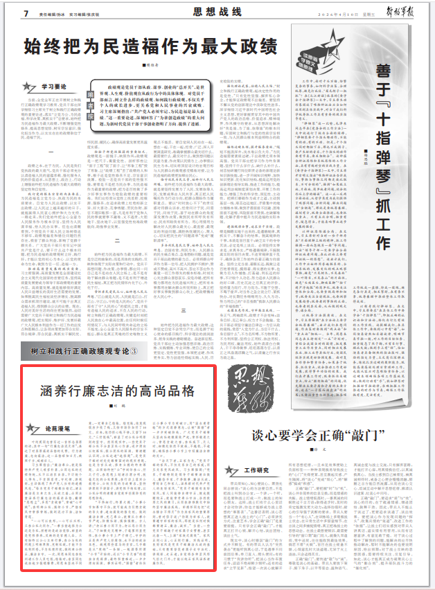 “一心可以丧邦,一心可以兴邦,只在公私之间尔。”一事当前选择为公还是为私,折射的是政治觉悟,彰显的是党性修养,反映的是官德人品。只有始终以公心立身行事,在公与私的问题上明晰界限、克制私欲,才能不为私利所惑,不为私情所扰,做到秉公持正、廉洁自守。一次,周恩来同志在杭州请工作人员吃饭,结账时,省里同志说由地方报销餐费,周恩来坚决不同意,一定要自己结账。结完账,他发现饭店少收了钱,又按市场价加付了10元。后来,他仍担心钱不够,又留下10元。“三付饭钱”,彰显了对公私分明原则的坚守。然而现实中,一些党员干部公私不分甚至私心作祟,逐步滑向以权谋私、损公肥私的深渊。要清醒认识到,公私这道“选择题”,是党员干部时时处处都要面对的现实考题,也是为官从政、修身立德的终身课题。必须始终把“公”字刻印在心、付之于行,在思想上划清泾渭分明、秋毫无犯的公私界限,在行动上落实公款姓公、公权为民的为政要求,坚持讲原则不讲面子、讲党性不徇私情,以公私分明的清醒自觉筑牢拒腐防变的思想防线。