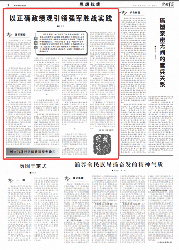 习主席强调:“当干部就要干事,就要创造业绩。创造业绩,必须解决好为谁创造业绩、创造什么样的业绩、怎样创造业绩的问题,也就是要解决好政绩观问题。”国防和军队现代化建设是一项伟大的事业,也是一场接力的远征。必须教育引导军队党员干部树立和践行正确政绩观,牢记“为人民扛枪、为人民打仗”的神圣职责,做到只要一声令下,召之即来、来之能战、战之必胜,有效履行新时代人民军队使命任务。