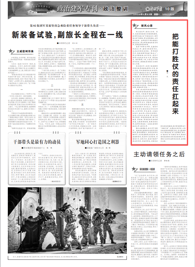 陌上春来早,练兵正当时。近日,笔者在某旅战术训练现场看到,旅领导打破以往“参谋先发言,领导做总结”的惯例,带头研判推演,主导作业进程。这种党员干部扛起能打胜仗责任、带头研战谋战的务实作风,受到基层官兵欢迎。