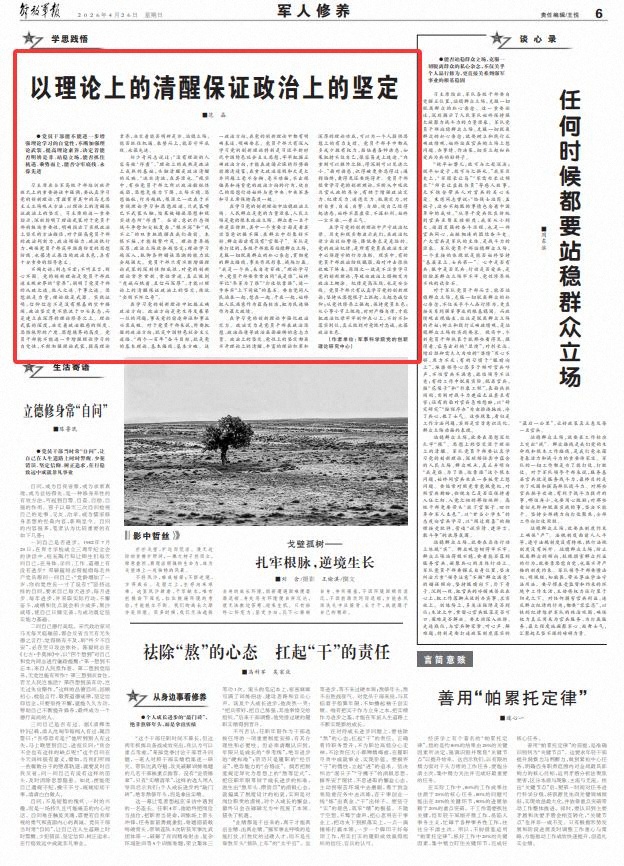 习主席在全军高级干部培训班开班式上的重要讲话中强调,要认真学习党的创新理论,掌握贯穿其中的马克思主义立场观点方法,以理论上的清醒保证政治上的坚定。习主席的这一重要指示,深刻指明了理论武装对于党员干部的极端重要性,明确指出了实现政治上坚定的方法路径,对于提高党员干部的政治判断力、政治领悟力、政治执行力,确保党员干部筑牢拒腐防变的思想防线、永葆清正廉洁的政治本色,具有十分重要的指导意义。
