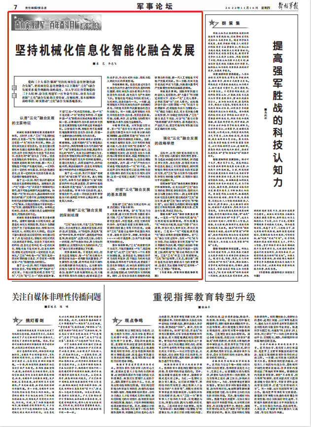 党的二十大报告强调“坚持机械化信息化智能化融合发展”,把机械化信息化智能化(以下简称“三化”)融合发展要求提升到新的战略高度。深入学习宣传贯彻党的二十大精神,奋力实现建军一百年奋斗目标,应着力认清把握“三化”融合发展的主要特征、深刻机理、基本原则和战略举措,切实推动“三化”融合发展落地落实。