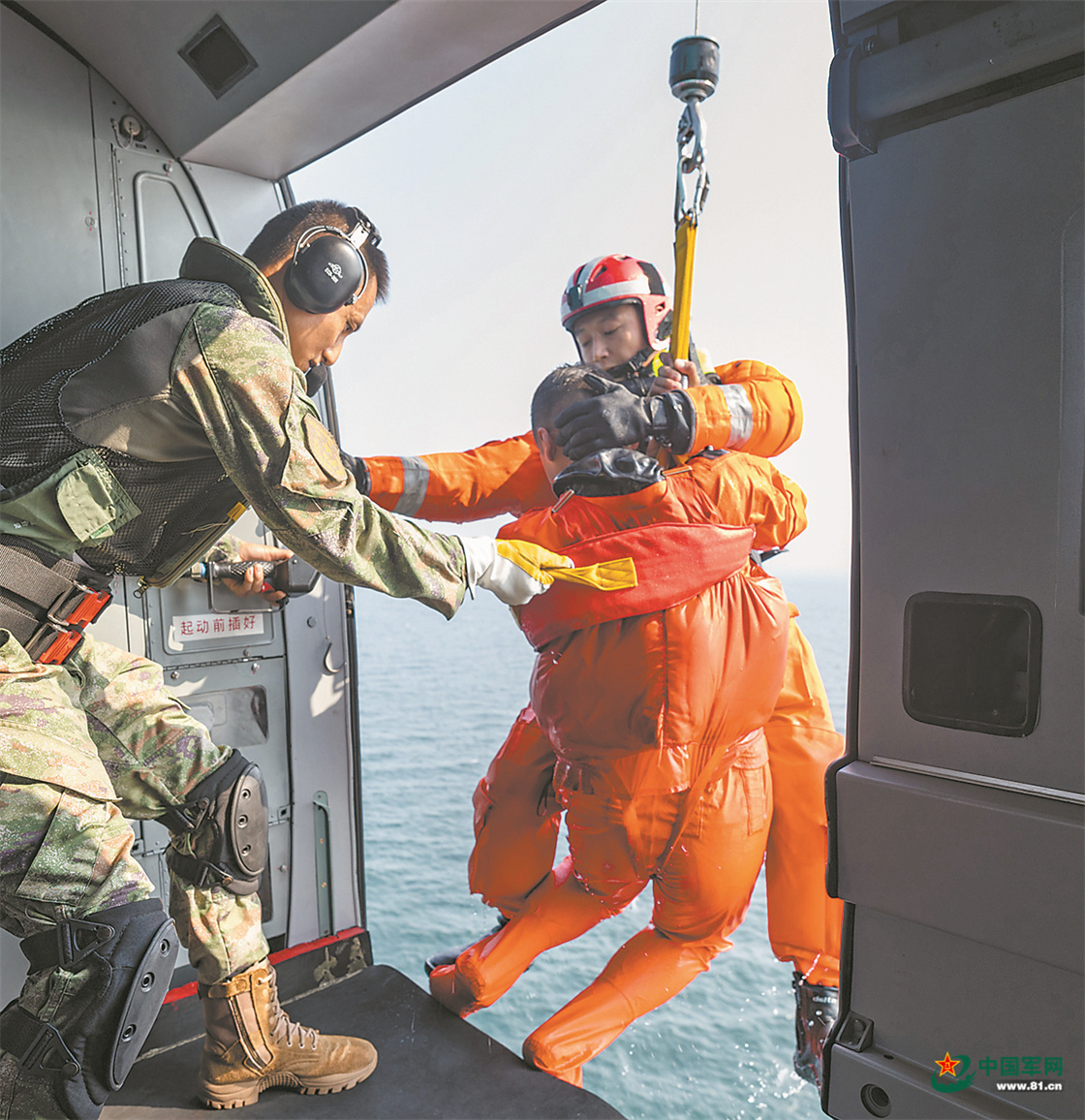 飞行员握紧驾驶杆,努力保持直升机稳定悬停姿态。救生员克服直升机气流和海浪影响,快速将救生套索固定在“遇险人员”身上,右手做出上升手势。返回机舱后,医护人员立即对“遇险人员”实施急救。