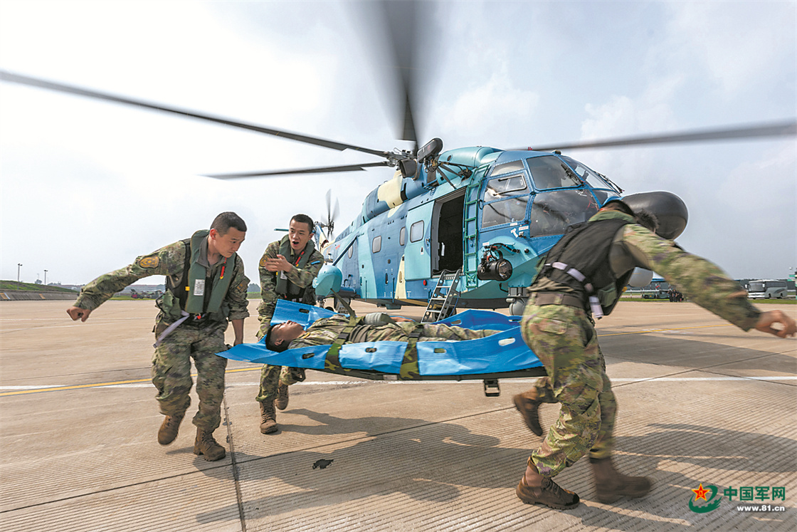 黄昏时分,直升机安全返场,机组官兵迅速将“遇险人员”转移至救护车。