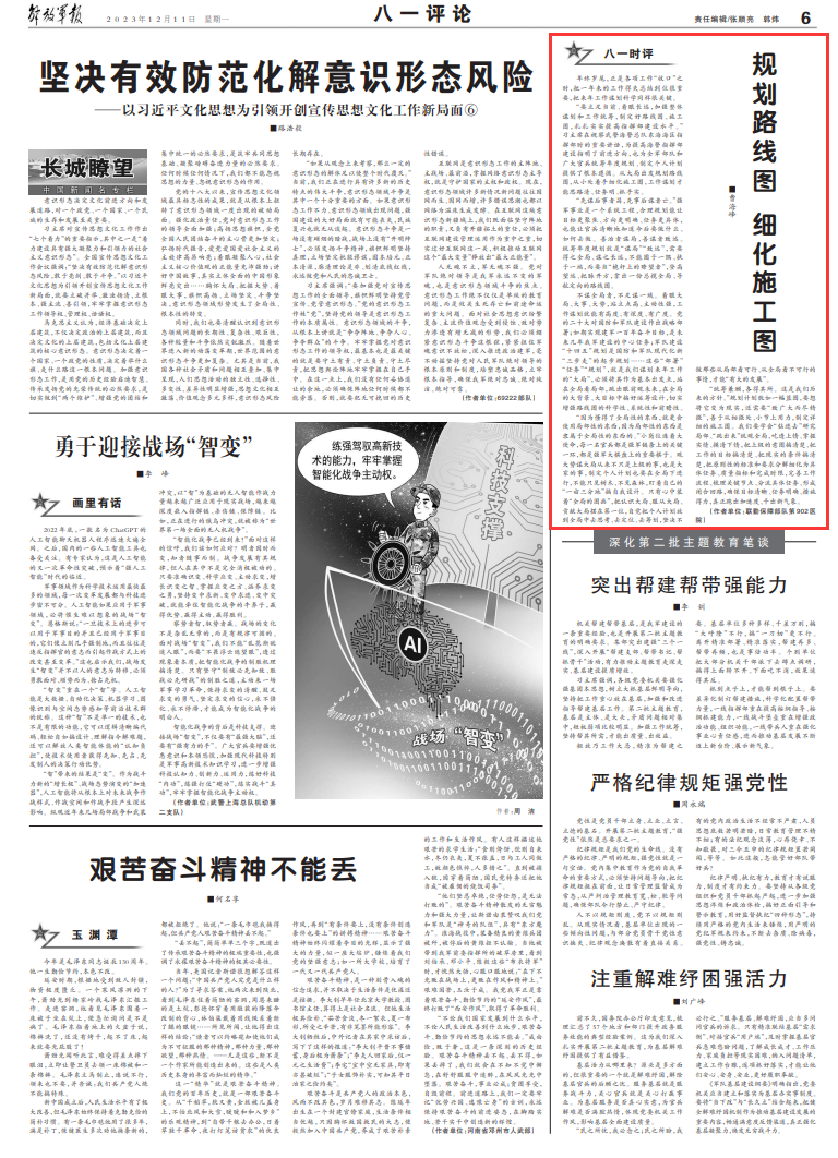 “因为懂得了全局性的东西,就更会使用局部性的东西,因为局部性的东西是隶属于全局性的东西的。”小岗位连着大使命,每一名官兵都是强军链条上的关键一环,都是强军大棋盘上的重要棋子。观大势谋大局从来不只是上级的事,也是大家的事,制定个人计划也要在全局下进行,不能只见树木、不见森林,盯着自己的“一亩三分地”搞自我设计。只有心中装着“全局的图画”,把认识大局、服从大局、贡献大局摆在第一位,自觉把个人计划放到全局中去思考、去定位、去筹划,坚决不做那些从局部看可行、从全局看不可行的事情,才能“有大的发展”。