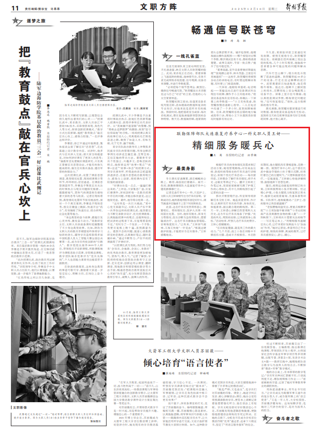 随后,按照运动康复技师制订的方案,王妍积极帮助小张开展训练。经过精心护理,小张左腿肌力恢复到正常水平,能够完成低姿匍匐、负重奔袭等训练。归队那天,他难掩激动:“王护士,您的服务让我倍感温暖!”