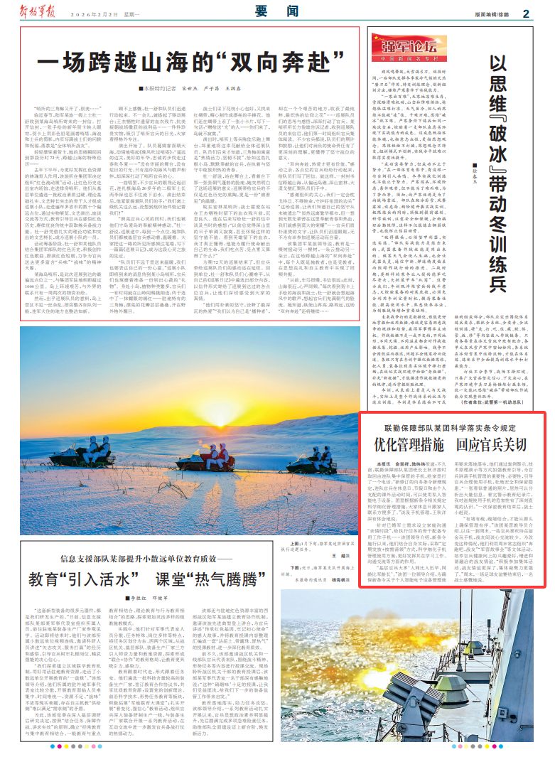 解放军报讯 俞凯祥、陆纬纬报道:不久前,联勤保障部队某团班长王秋洋按时取回由连队集中保管的手机,给家里打了一个电话。“新修订的内务条令新增规定,连队官兵在休息日、节假日和由个人支配的课外活动时间,可以使用私人智能电子设备。团里根据新条令相关规定科学细化管理措施,大家休息日跟家人联系方便多了。”谈及手机管理,王秋洋深有体会地说。