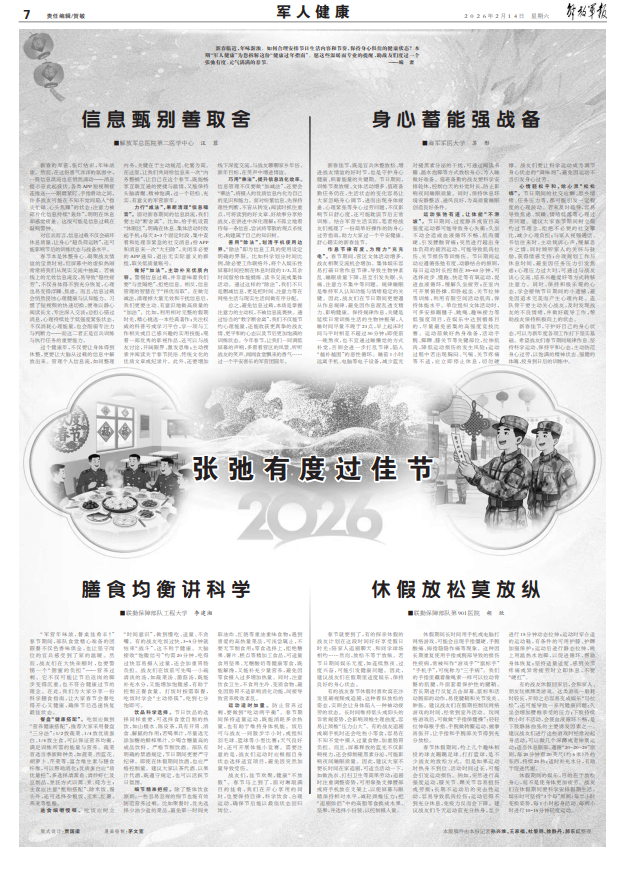 新春临近,年味渐浓。如何合理安排节日生活内容和节奏,保持身心俱佳的健康状态?本期“军人健康”为您拆解这份“健康过年指南”。愿这些温暖而专业的提醒,助战友们度过一个张弛有度、元气满满的春节。