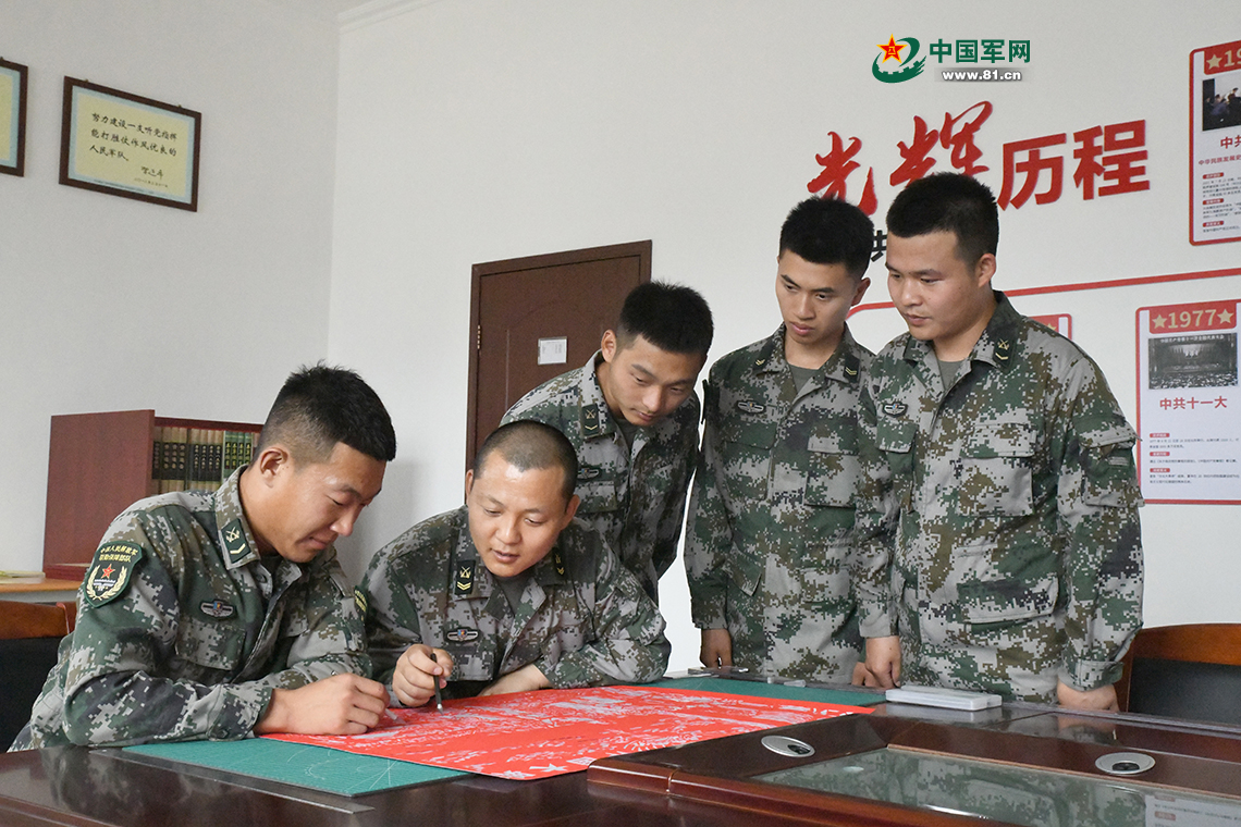 “一定要把刻刀竖着握,注意力度和深度,既要刻断,又不能刻过头……”四级军士长陈亚虎是红色剪纸的“老师傅”,课余时间总能看到他带着“三帮一带”小组成员在创作室细细钻研,尽管在战士们眼中他是雷厉风行、不苟言笑的老班长,但拿起刻刀的那一刻,他便会成为细致耐心讲解剪纸技巧的“手艺人”。