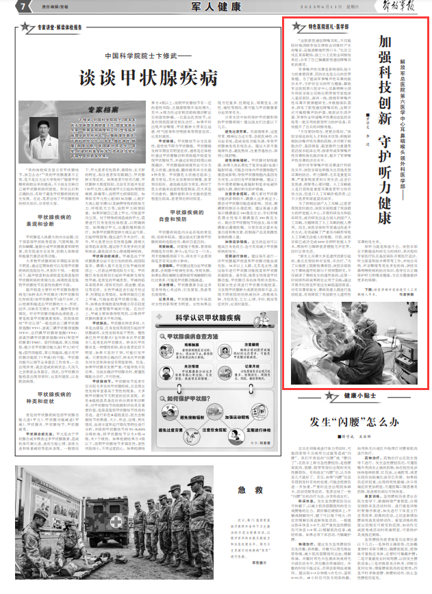 保听力就是保战斗力。该医学部在不断提高科研实力的同时,多次组织专家医疗队在基层部队开展医疗巡诊、听力筛查和技术帮带等工作,并结合耳鸣、声音嘶哑等易发多发疾病,讲授耳鼻咽喉疾病的防治知识,指导官兵正确保护听力和嗓音健康,为官兵健康提供更多的保障。