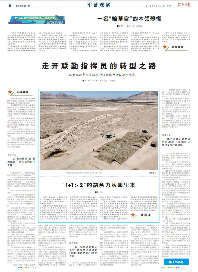 “保障对象从单一到多元、保障行动由平面到立体、保障点位由分散到集中等多种转变,是一项囊括思维理念更新、能力素质升级、战法运用创新等多环节多维度的系统工程。”该旅领导介绍说,从头脑风暴到破解难题,新型“粮草官”闯开了能力升级之路。