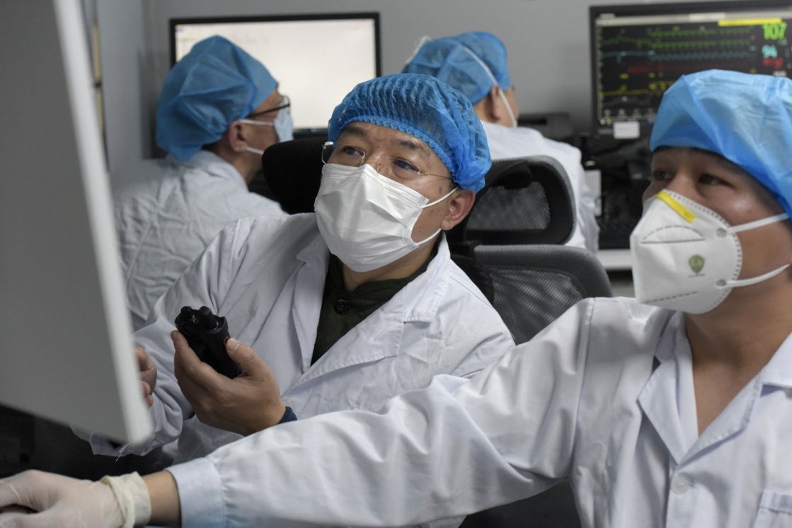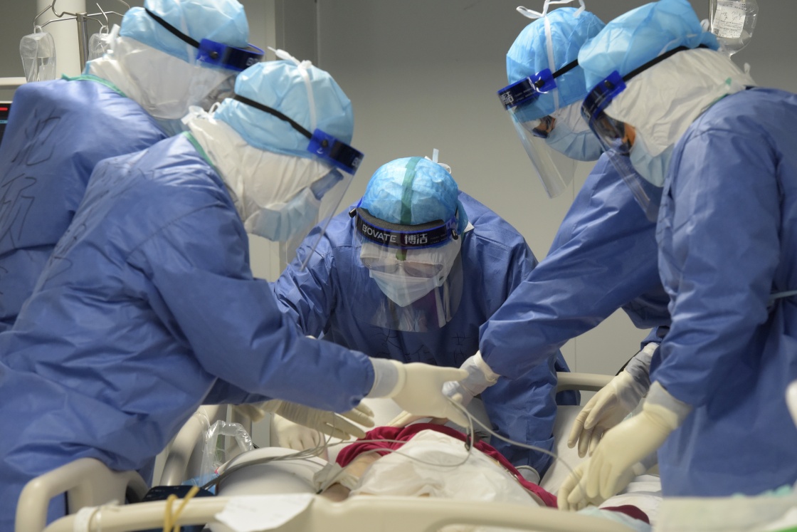 李维勤(中)带领医护人员在武汉火神山医院重症二科病房为患者实施俯卧位通气(2月25日摄)。新华社发(范显海 摄)