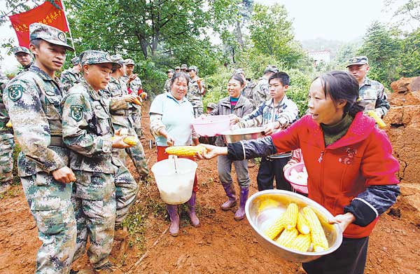 连日来,云南省昭通军分区官兵和民兵在鲁甸地震灾区奋力抢险救灾,许多官兵和民兵忙得顾不上吃饭和休整。灾区群众看在眼里、疼在心里。图为8月12日,几位灾区大嫂把煮熟的玉米棒送到救灾官兵和民兵手里。
