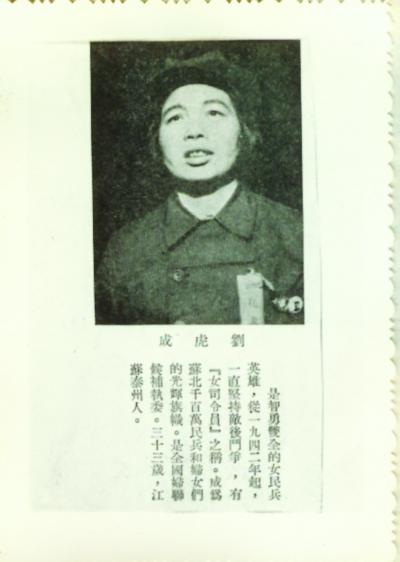 当年,姜堰的老百姓对刘虎成的名字是非常熟悉的,曾亲切地称她为:“刘司令”。1942年,姜堰还在日伪统治下的时候,刘虎成就秘密参加了中国共产党。当时她刚生孩子不久,组织上让她一边照顾孩子,一边往返在敌人的封锁线之间,为党做交通联络工作。抗日民主政权建立后,刘虎成又领导农民和妇女,进行减租减息斗争。她组织广大妇女成立妇救会,以走亲戚、回娘家作掩护,多次完成乡与村、村与村的组织联络工作。