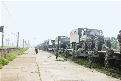 该市组织民兵协助参演部队装载重型装备。 刘博阳摄