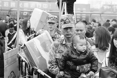 今年春运期间,广东省深圳市沙井街道武装部组织民兵队员来到火车站、长途客运中心,担负安保、疏导人群、旅客咨询等任务。“迷彩绿”在人流中格外醒目,他们有的帮旅客搬行礼,有的帮忙抱孩童、搀扶老人……“这身迷彩绿看着就让人心安!”旅客们纷纷点赞。 田海潮 摄