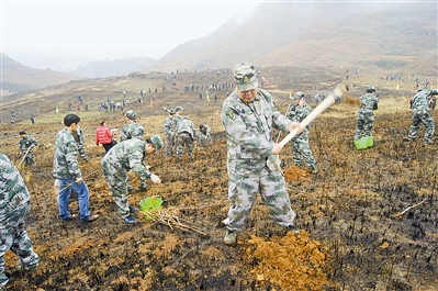 近日,贵州省玉屏县人武部组织干部职工、民兵应急分队队员和各乡镇基干民兵近2000人,在全县范围开展大规模植树造林活动,打响了生态建设的攻坚战。黄明益摄