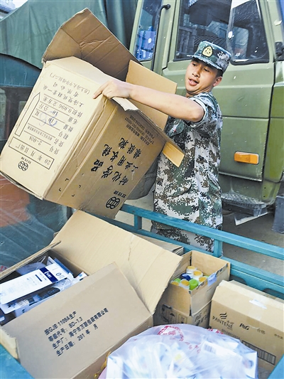 深一脚浅一脚走在渣石上,林秀平几次差点摔倒,民兵们劝他歇一会,他说:“难得趁休假为灾区出一份力,有劲就要全部使出来。”整整一天的救援行动,运送油料、警戒执勤……哪里需要他就出现在哪里,渴了,咕噜一瓶水喝下;累了,用袖口拭把汗,又接着战斗。
