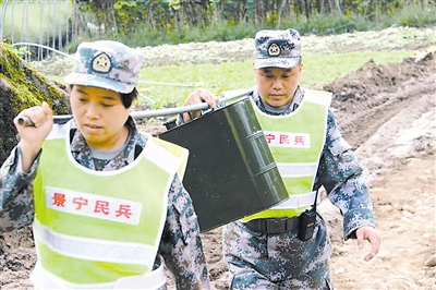 29日一大早,张春荣又匆忙赶到北界镇,搭乘摆渡车来到救援现场,听说加油车开不上塌方现场,急需调集民兵应急分队给挖掘机运送油料,他来不及和军分区部队的老战友寒暄,就和一名民兵结成对子,直奔加油车。