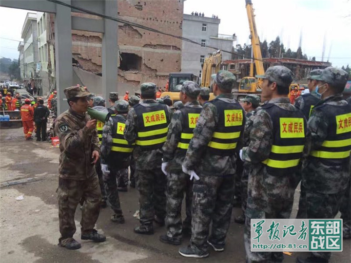 温州军分区接到地方求援电话后,立即启动应急响应机制。军分区参谋长张道义带前进指挥所火速向灾害现场机动,同时命令文成县人武部部长吴步程带民兵第一时间赶赴现场。 8时21分,第一批民兵到达现场展开救援。面对一片狼籍的建筑倒塌物,大家用双手刨挖瓦砾,用铁锹等简易工具搬运土石,与时间展开赛跑,全力搜救被困人员。