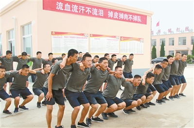为筛选优质兵员,8月下旬,河南省内乡县人武部组织体检合格的322名应征青年到民兵训练基地进行全封闭训练。图为应征青年进行行为拓展训练。王礼光摄