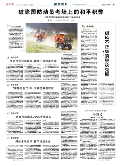 考场定胜负,不亚于战场决生死。习主席深刻指出,训风不正是对官兵生命、对未来战争极大的不负责任,危害甚大,必须坚决克服。和平时期可以补考,战场绝无补考机会。考场歪风留下的陷阱,战场上势必会用官兵的鲜血和生命来填平。考场谁设?考题谁出?考官谁当?考卷谁评?在组织军事训练考核中,需要我们认真思考和回答。