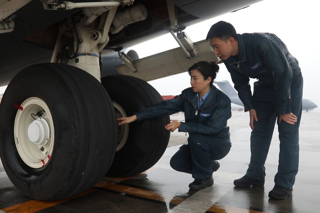 全国人大代表、空军特级飞行员陈金兰(左)在飞行前检查运-20飞机起落架情况(1月14日摄)。新华社发(刘卓超摄)