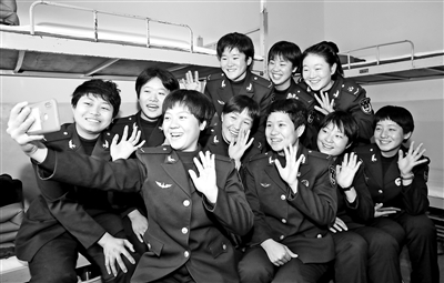 “爸爸妈妈,我们授衔啦!看你们的女儿漂亮不?”12月13日,新疆军区某师新兵团举行授衔仪式,佩戴列兵军衔的新兵纷纷表示要练强本领、努力学习,争当优秀士兵。图为新兵赵文(前排左一)与家人视频通话,全班战友向其父母招手问好。