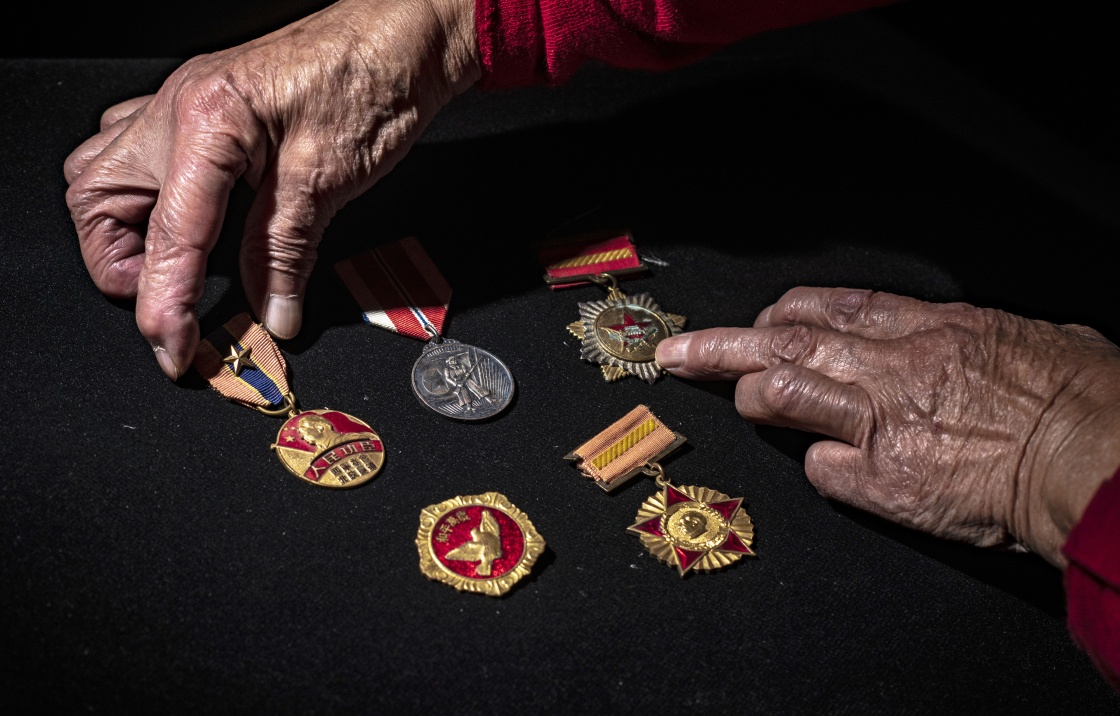 在云南省昆明市,志愿军老战士杨秀珍整理军功章(9月27日摄)。新华社记者 江文耀 摄
