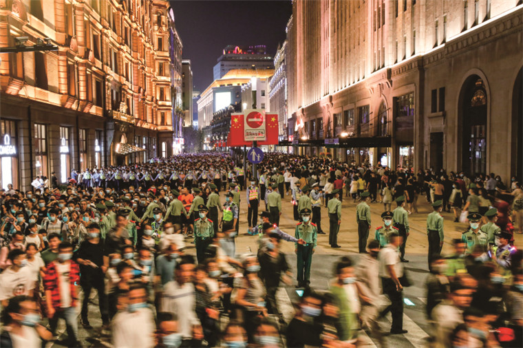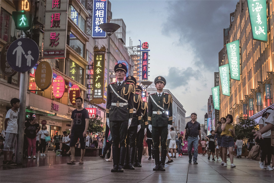 中队官兵在“中华商业第一街”南京路上巡逻。李岩 摄
