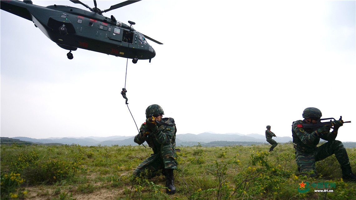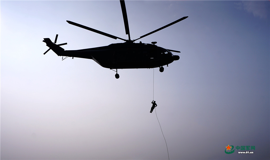 特战队员运用下滑绳进行索降。