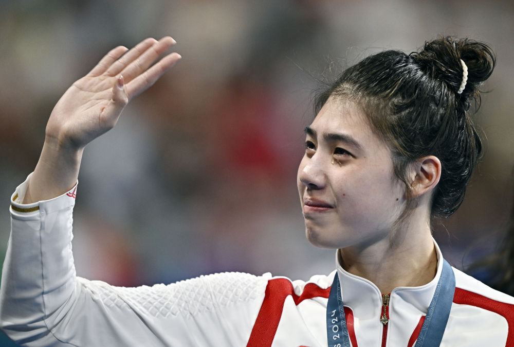 ↑7月28日,女子100米蝶泳季军张雨霏赛后向观众致意时落泪。