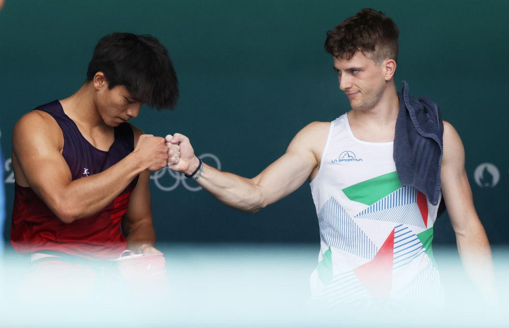 ↑8月8日,中国选手伍鹏(左)与意大利选手祖尔洛尼在攀岩男子速度赛四分之一决赛前相互致意。
